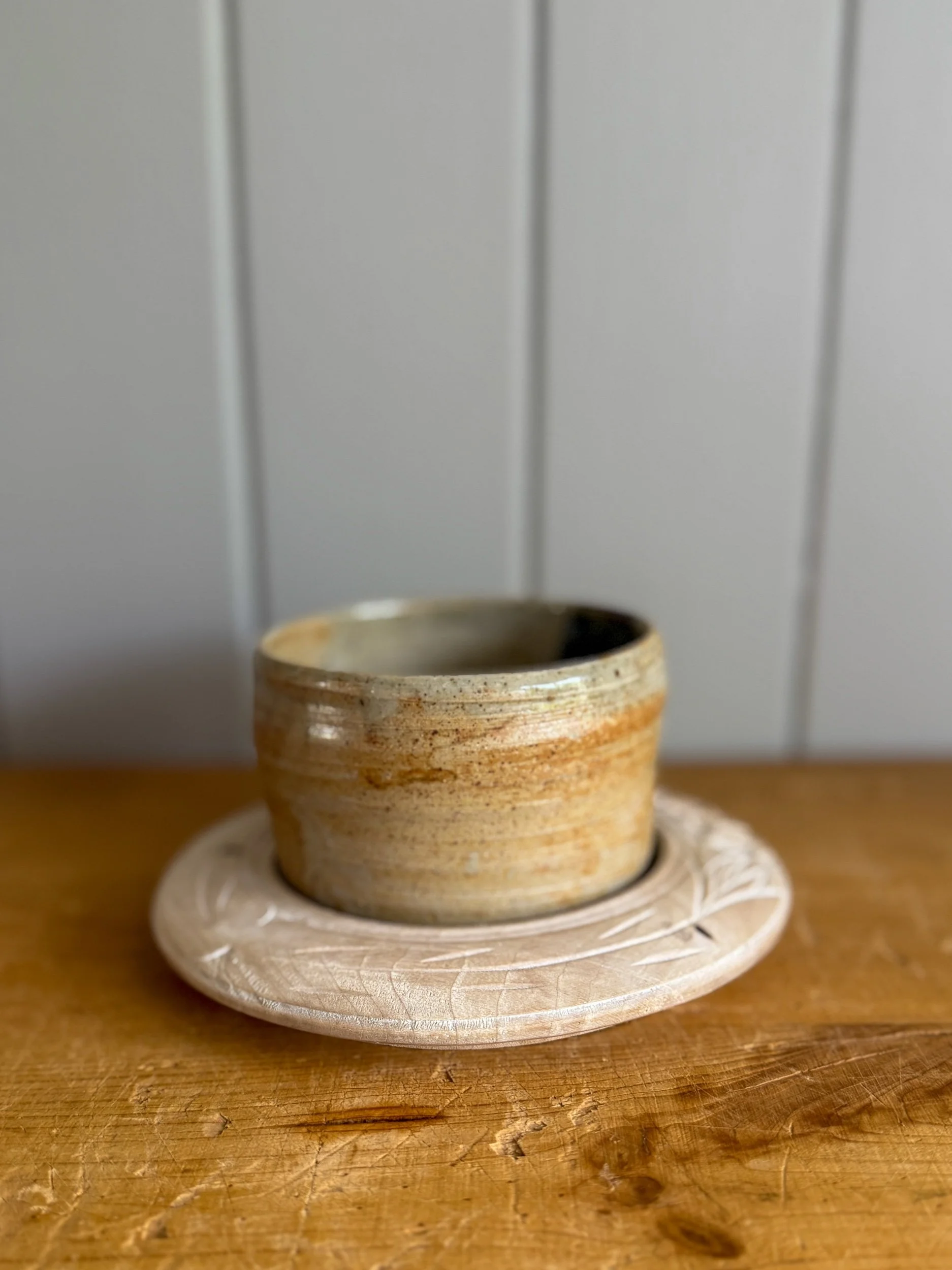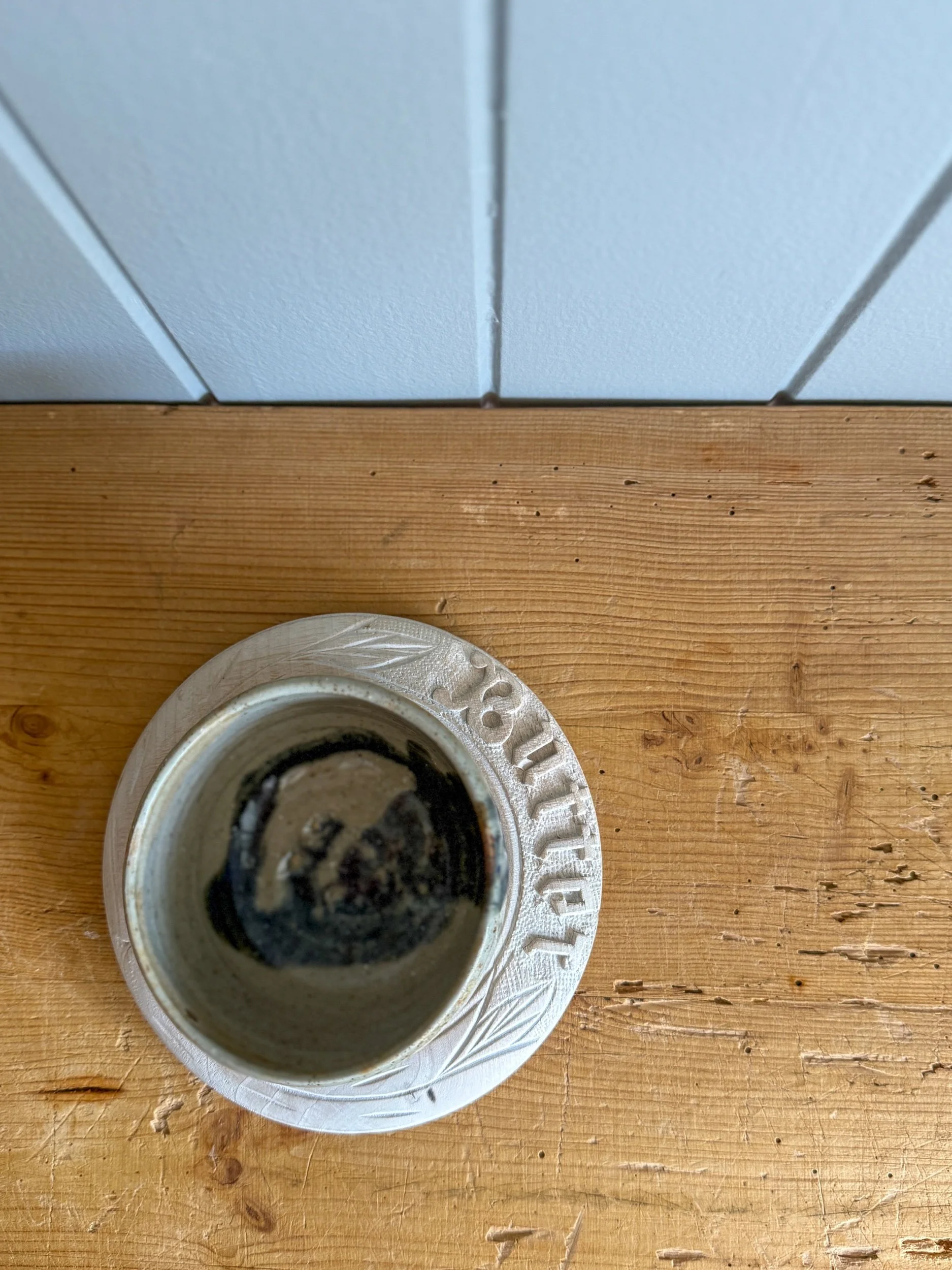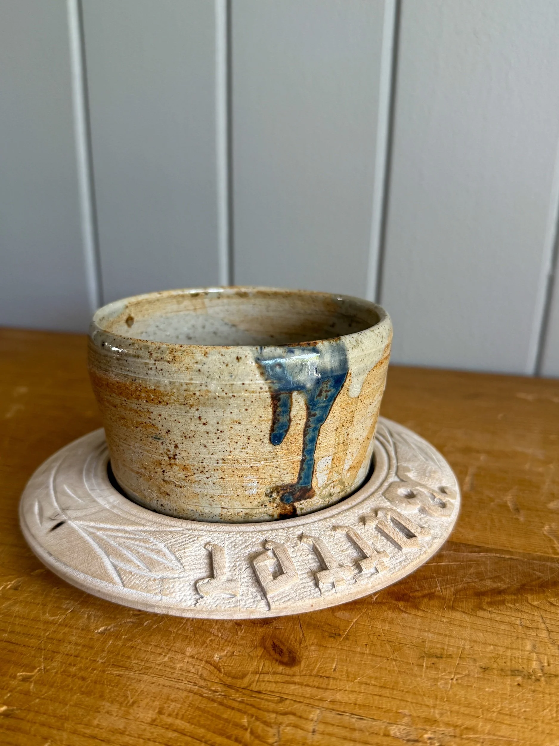 This little butter dish is both pretty and practical. With golden hues and a deep blue glaze drip, this piece is the perfect addition to your breakfast table setting.